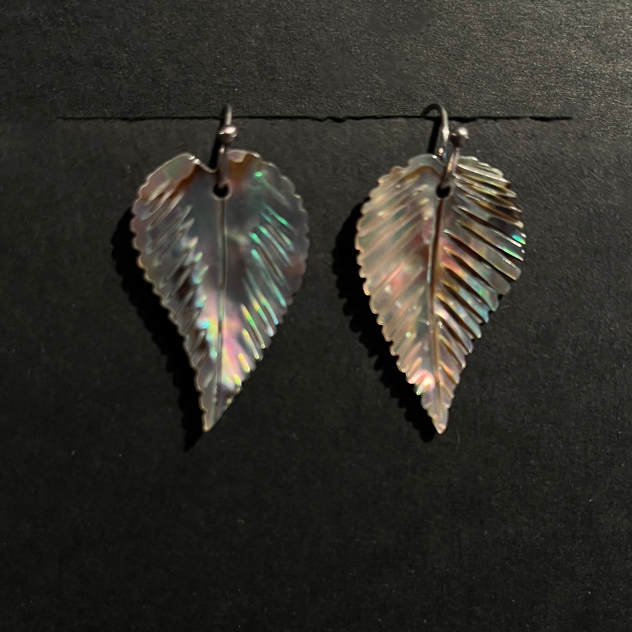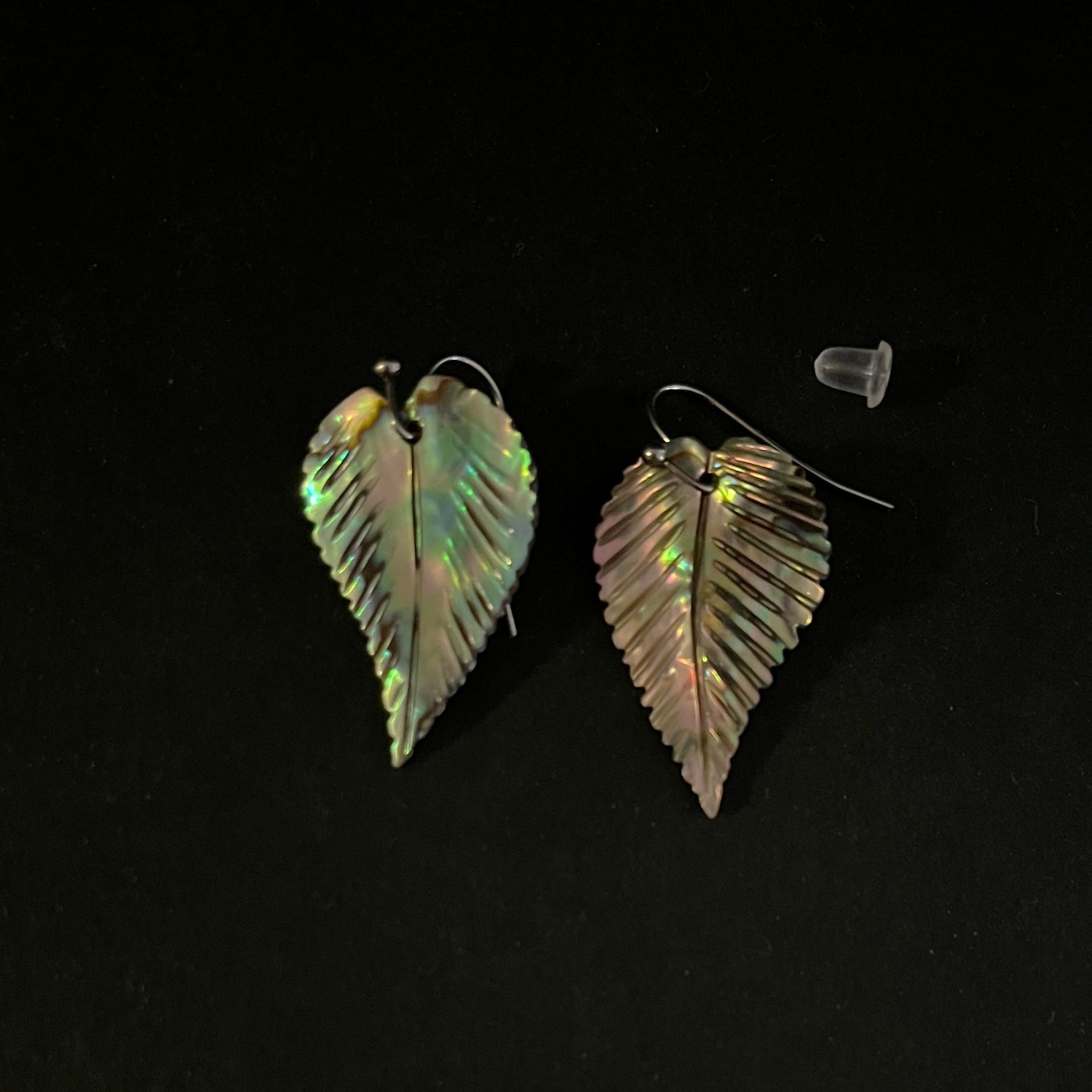 Örhängen med "blå/gröna" löv av pärlemor, höjd ca 3,5 cm inklusive krok. Det levande materialet skimrar i olika färger beroende på ljuset.